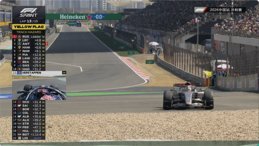 第11圈,安东内利内线抽头,超越汉密尔顿来到第三。第13圈,霍肯博格停在了1号弯,安全车出动!在安全车出来之前,安东内利超越勒克莱尔!10秒的罚时或许都被消耗完了!